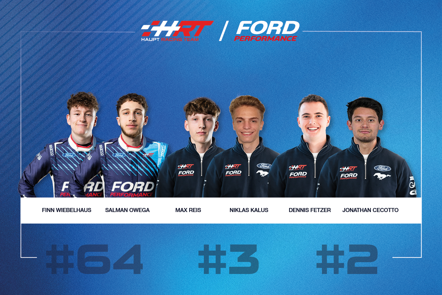 Im Ford Mustang GT3 mit der Startnummer 64 nehmen Salman Owega (19 / Köln) und Finn Wiebelhaus (18 / Offenbach) Platz. Beide wurden als Ford Performance GT3 Junior in den Nachwuchskader von Ford berufen und verfügen bereits über Erfahrung im ADAC GT Masters. Owega wurde 2023 Meister und hat insgesamt sieben Siege sowie vier weitere Podiumsplatzierungen zu Buche stehen. Wiebelhaus erreichte in seiner Rookie-Saison 2024 Platz vier der Gesamtwertung und feierte einen Sieg sowie zwei Podestplätze.