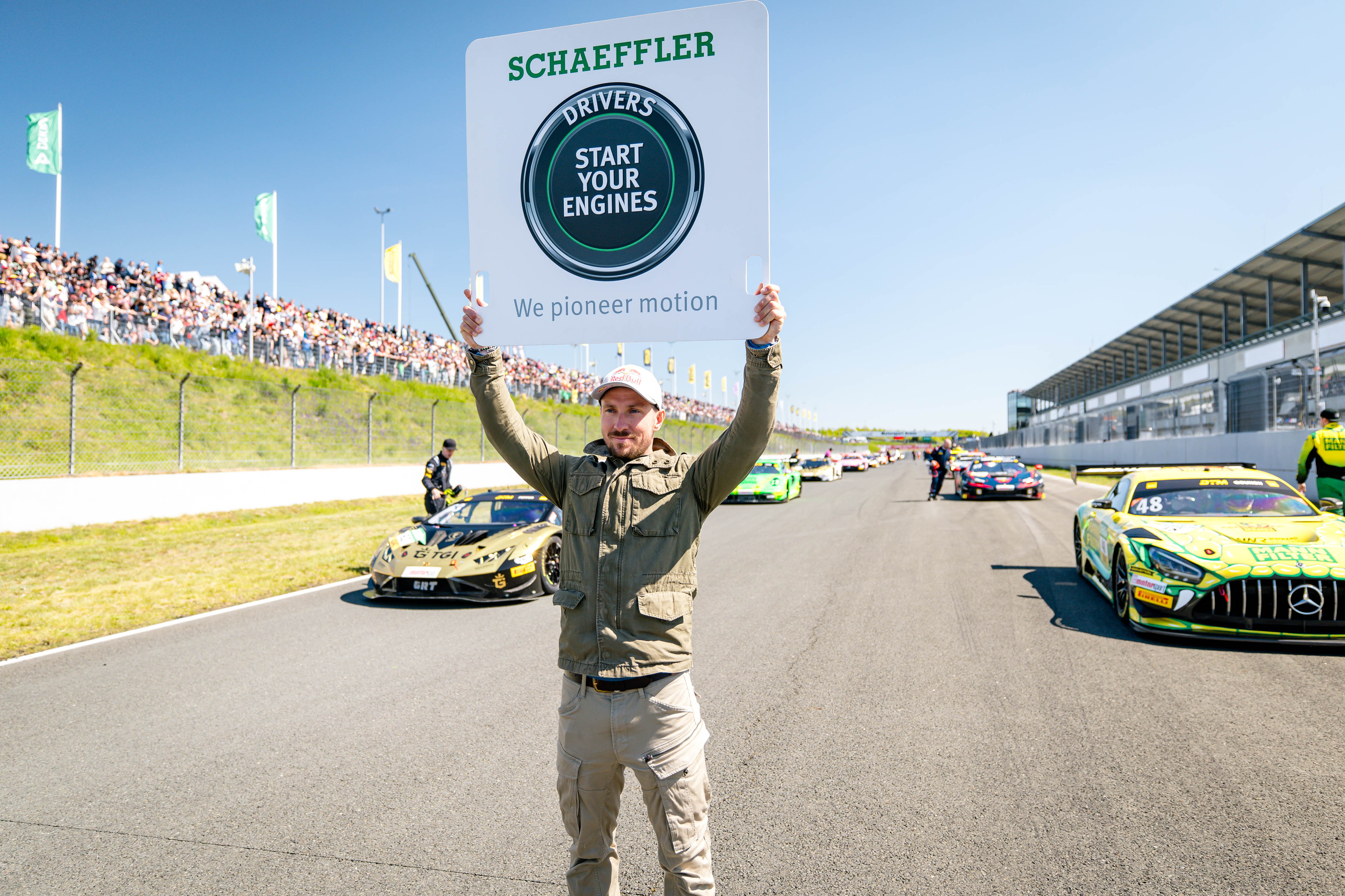 DJ Tomekk war auf Einladung von Abt Sportsline sowie Schaeffler Gast in Oschersleben und hatte vor Ort viel zu tun: Am Samstagmittag schickte er das DTM-Feld mit dem Schild „Drivers start your engines“ in den ersten Saisonlauf. Abends präsentierte DJ Tomekk live bei Schaeffler mit „Fiona – Maschinen aus Stahl“ den brandneuen Titelsong zur „Green Machine“ von seinem Idol Marco Wittmann. Der BMW-Pilot war beeindruckt. „Ich kenne sonst keinen DTM-Fahrer, der einen eigenen Song hat. Das ist eine super coole Geschichte. Beim Live-Auftritt am Samstagabend hat DJ Tomekk die Zuschauer direkt begeistert.“