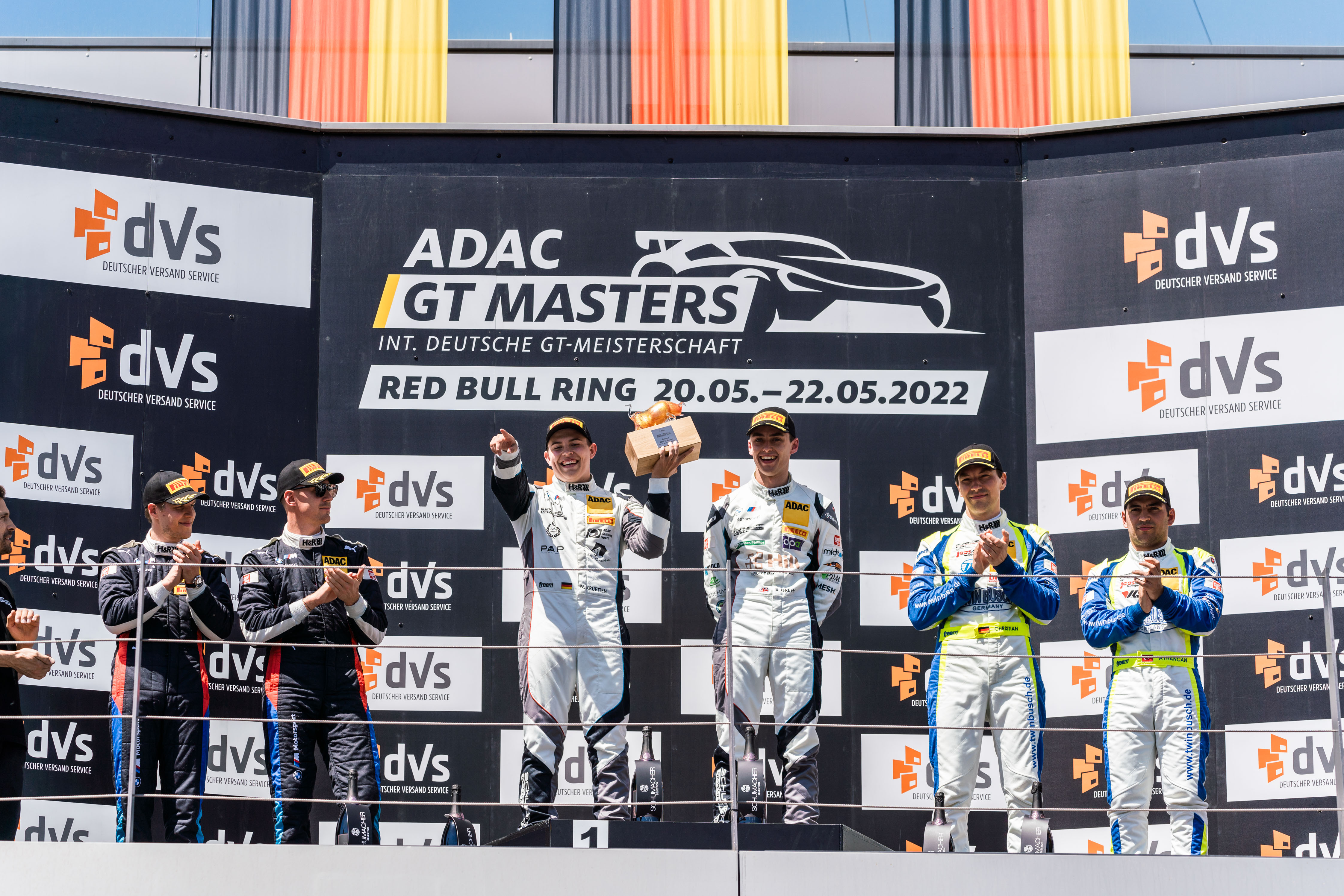 Niklas Krütten war am Sonntag um 13 Uhr im BMW M4 GT3 #10 als Pole-Setter in das zweite Rennen auf dem Red Bull Ring gegangen. Mit einem Top-Start verteidigte der Youngster seine Spitzenposition und übergab sein Fahrzeug in Führung liegend nach einem frühen Boxenstopp in der 26. Minute an seinen Kollegen Ben Green. Der Brite baute den Vorsprung kontinuierlich aus und machte nach 41 Runden den souveränen Start-Ziel-Sieg und damit den Doppel-Erfolg in Spielberg im zweitschnellsten Rennen in der Geschichte des ADAC GT Masters perfekt. Im Feld dahinter sahen die Zuschauer auf den vollen Tribünen des Alpenkurses spannende Positionskämpfe und harte Duelle. Jesse Krohn und Nicky Catsburg sicherten sich im Schwesterauto den zweiten Platz gegen einen immer stärker werdenden Ayhancan Güven, der zusammen mit Christian Engelhart im Porsche 911 GT3 R #91 erneut auf das Podium fuhr.