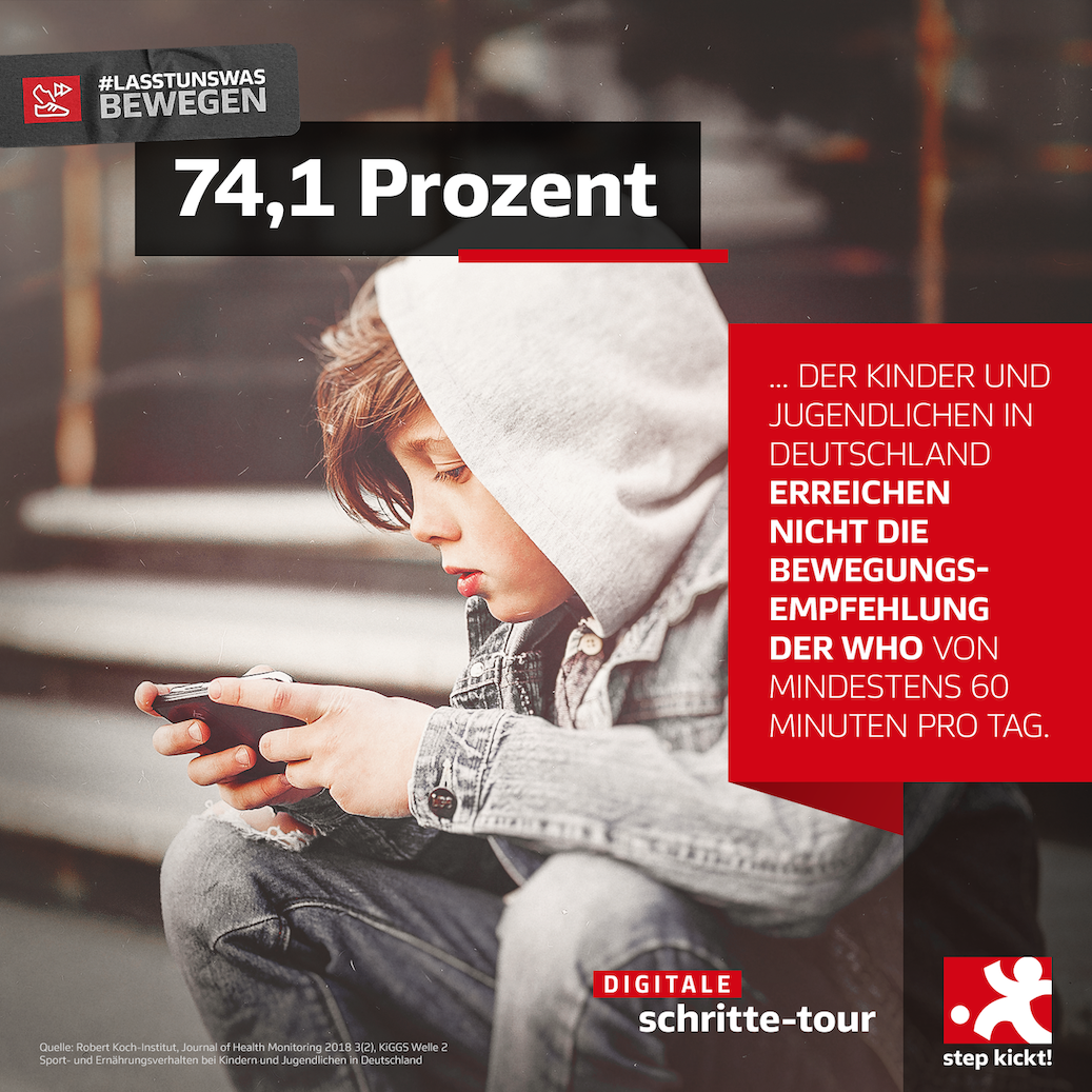 2000 Kilometer innerhalb einer Woche zu erlaufen war das gesetzte Ziel. Dabei ging es nicht nur darum, Bewegung in den eigenen Alltag zu bringen. Mit der digitalen Schritte-Tour wurden auch die Kinder von „step kickt!“ unterstützt. Dank der vielen Teilnehmer*innen, die täglich ihre Schritte trackten, wurde die Zielvorgabe sogar übertroffen: 4.299 Kilometer (6.448.284 Schritte) wurden innerhalb der Woche gemeinsam erlaufen. Als Belohnung erhalten im Nachgang alle siebzehn „step kickt!“-Schulen ein zusätzliches Bewegungspaket für den Schulalltag.