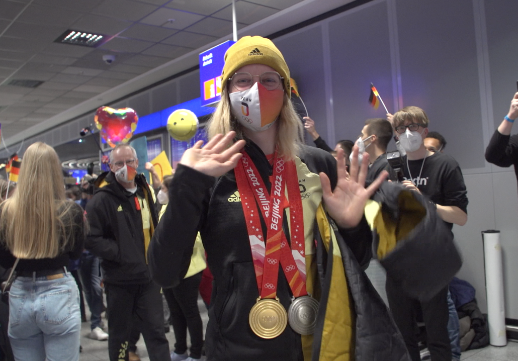 Am zweiten Tag der Ankunft des Team Deutschland sind weitere Olympiasieger und Athleten sicher auf deutschem Boden gelandet. Die Gold-Gewinner Francesco Friedrich, Laura Nolte, Deborah Levi und Victoria Carl wurden von Freunden und Familie in Empfang genommen und sprachen im Anschluss über ihre Zeit in Peking.