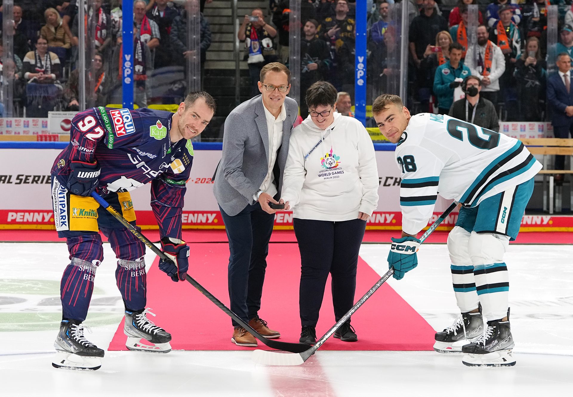 Bei der NHL Global Series Challenge zwischen den San Jose Sharks und den Eisbären Berlin in der Mercedes-Benz Arena war auf den Helmen aller Spieler der Sharks, das Motto der Special Olympics World Games 2023 in Berlin zu lesen: #UnbeatableTogether (#ZusammenUnschlagbar). Special Olympics Athletin Juliana Rößler und der ehemalige deutsch-kanadische NHL-Profi Rob Zepp eröffneten vor 12.000 Besucher*innen mit dem zeremoniellen Puck-drop das Spiel.