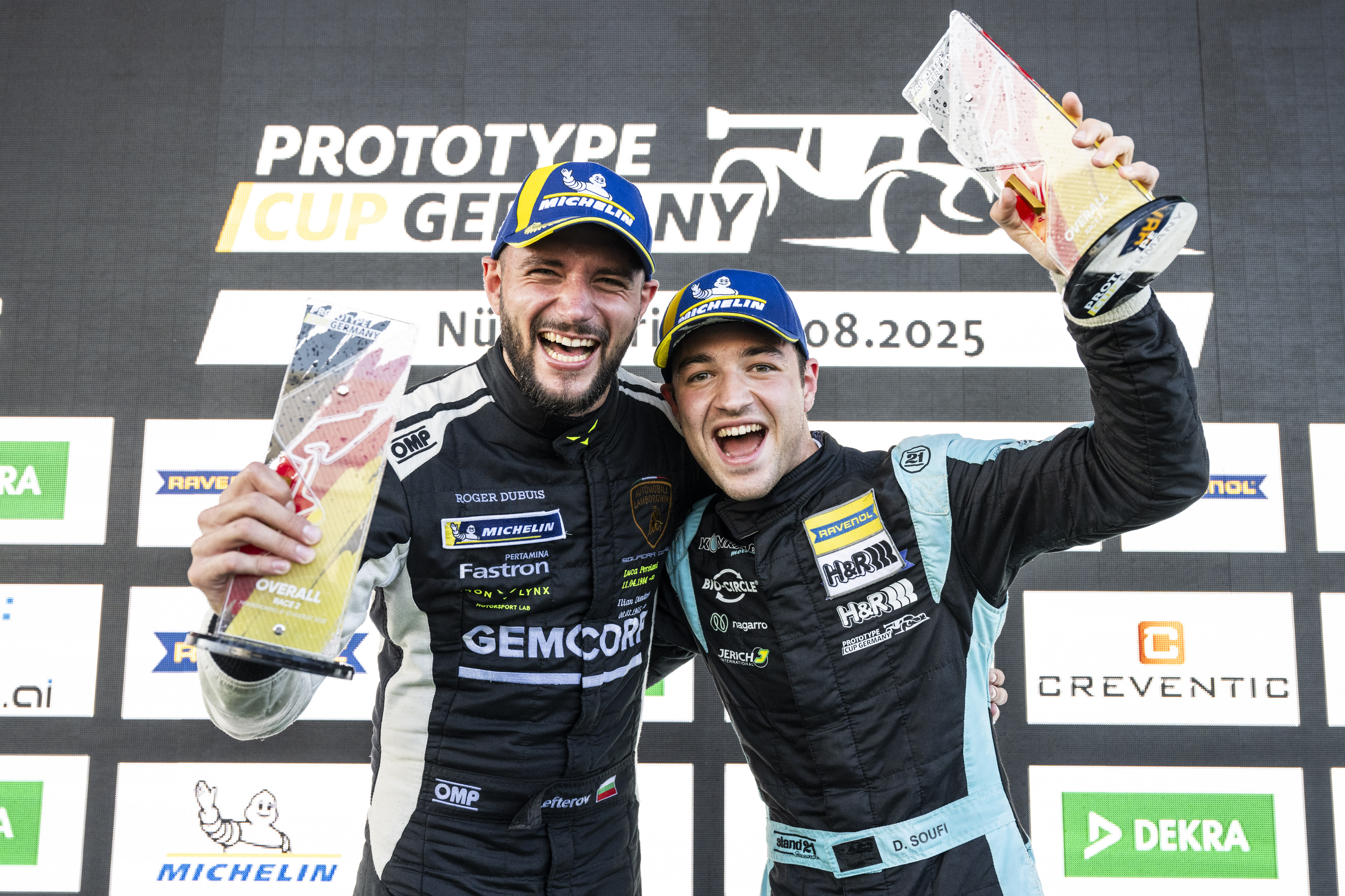 Der Jubel fiel dieses Mal sogar etwas lauter aus, denn die bulgarisch-amerikanische Paarung darf sich vorzeitig Meister im Prototype Cup Germany 2025 nennen. „Ich bin happy und auch erleichtert, dass wir es hier geschafft haben, nachdem wir durch den Sieg gestern schon so nah dran waren“, strahlte Soufi, der seit dem Premierenjahr des Prototype Cup Germany im Jahr 2022 in der deutschen LMP3-Serie am Start ist. Und auch Lefterov freute sich: „In meiner ersten Saison in der LMP3-Klasse gleich Meister zu werden ist natürlich besonders. Das Team hat uns immer ein tolles Auto zur Verfügung gestellt und Danny als Teamkollege war für mich perfekt. Er ist schnell und wir passen auch menschlich sehr gut zusammen.“ Platz zwei im Rennen auf dem Nürburgring ging an die besten Junioren Riccardo Leone Cirelli (17/ITA) / Mattias Bjerre Jakobsen (18/DEN) vor Mattis Pluschkell (21/Elmenhorst) / Maksymilian Angelard (18/POL, alle BWT Mücke Motorsport). In der Trophy revanchierte Thomas Ambiel (45/Eppingen, Rinaldi Racing) sich für seine gestrige Niederlage gegen Michael Herich (48/Brühl, Gebhardt Intralogistics Motorsport) und gewann vor dem Gebhardt-Piloten. Damit ist dem Rinaldi-Schützling der Titel in der Trophy-Wertung nicht mehr zu nehmen.